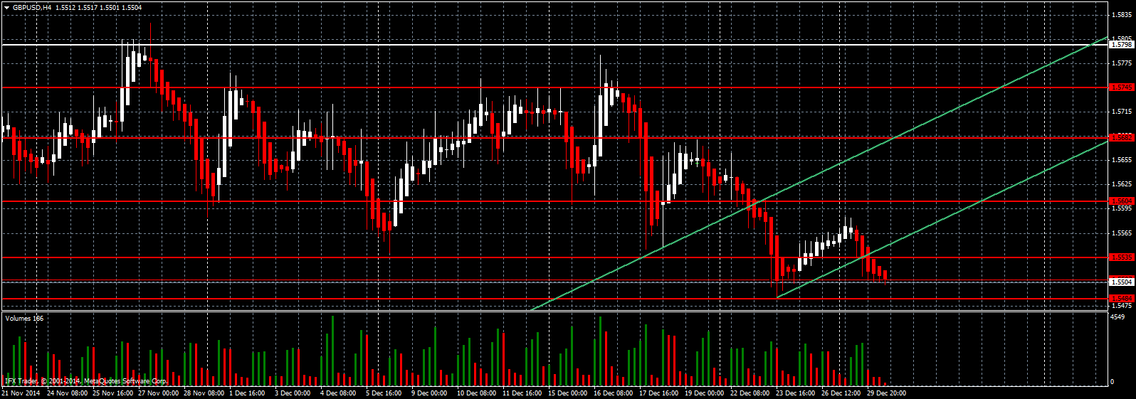 Шортисты вновь провалили нижнюю границу восходящего канала зеленого цвета R2, а также закрепились под важной поддержкой 1.5535, что даёт дальнейшие стимулы для продаж британского фунта в среднесрочной перспективе. Свечной индикатор Heiken Ashi рисовал вчера крупные красные свечи, которые сопровождались с ростом объема, и это при условии низкого объема торгов в предпраздничные дни. Возможно, многие инвесторы продолжают ставить на дальнейшее повышение доллара в 2015 году.