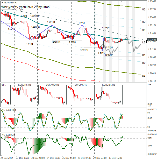 Перед Новым годом рынок тонкий. В условиях низких объёмов от рынка можно ожидать что угодно. По последним котировкам пара евро/доллар торгуется по 1,2161. Несмотря на отскок EUR/USD к 1,2185, единая валюта из-за ситуации в Греции останется под давлением. «Медвежий» тренд по ней перейдёт на 2015 год.