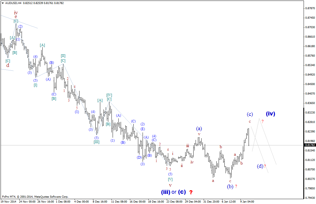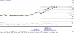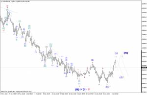Таким образом, складывающаяся волновая ситуация, по прежнему, позволяет предполагать, что валютная пара остается в процессе формирования волны (iv), которая приобретает признаки одного из коррекционных треугольников. Если это так, то сегодняшний максимум, можно рассматривать в качестве вершины волны (С) такого треугольника, а обозначившееся нисходящее движение, началом его волны (d).