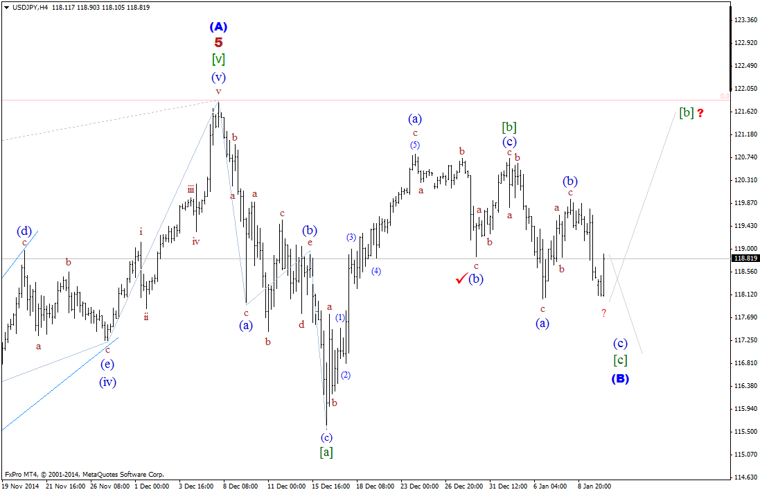 Таким образом, складывающаяся волновая картина, пока позволяет рассматривать текущее нисходящее движение, как процесс формирования волны [с], в (В), которая к тому же выглядит не совсем завершенной. Если это так, то валютная пара может продолжить снижение котировок к уровню 117-й, или даже 116-й фигуры. Хотя окончание волны [с], выглядело бы предпочтительней в районе отметки 115,50.