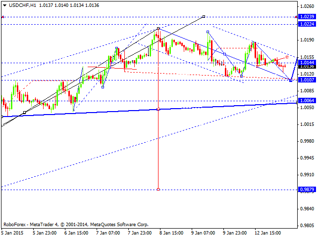 Валютная пара доллар франк продолжает торговаться в волне снижения как коррекция к уровню 1.0110. Далее будем рассматривать возможность развития ещё одной волны роста на отработку уровня 1.0225. Затем ожидаем развитие более существенной коррекции к уровню 1.0060.