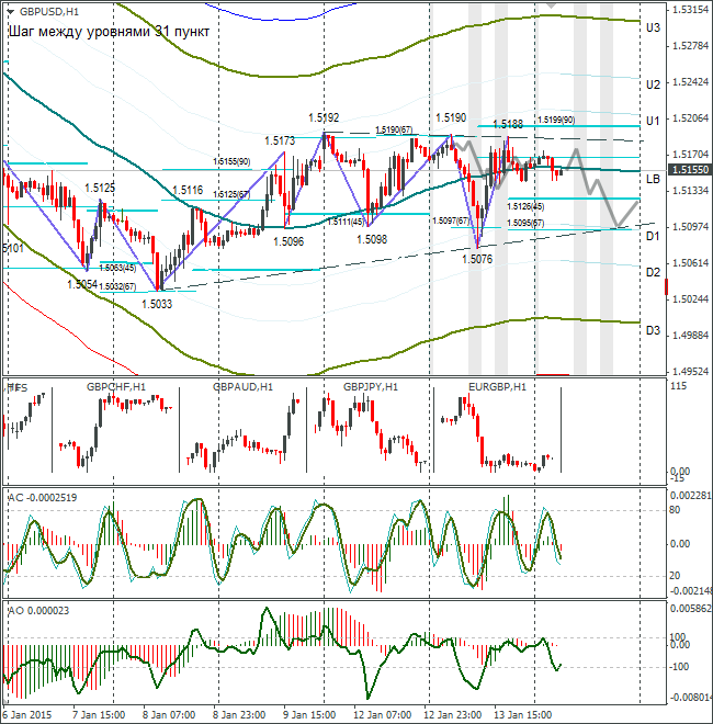 На уровне 1,1750 образовалась новая поддержка. В данный момент при текущем положении часовых индикаторов не представляется возможным пройти этот уровень. Считаю, что неплохо бы скорректироваться к линии lb. Объясню почему. Вчера евро и фунт из-за кросс-пар показали разнонаправленную динамику. Сейчас необходимо между однонаправленными парами (EUR/USD и GBP/USD) сократить разрыв. Т.е. фунт должен упасть в район 1,5120, а евро укрепиться до 1,18. В этом случае индикаторы разгрузятся и затем после 2-х или 3-х часового бокового движения у долларовых быков появится шанс вплотную приблизиться к уровню 1,17.