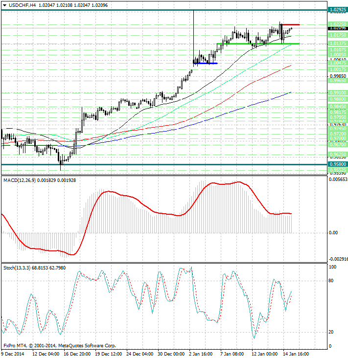 Курс валюты вновь расположен выше скользящих средних с периодами 34, 55, 89 и 144, которые направлены вверх и указывают на сохраняющиеся бычьи настроения (в среднесрочной перспективе), а также являются рядом уровней поддержки 1.01725, 1.01325, 1.00375 и 0.9915.