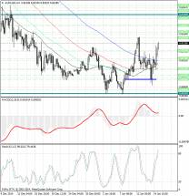 Гистограмма MACD по-прежнему расположена в положительной зоне и выше своей сигнальной линии, продолжает плавно повышаться и тем самым подает сигнал на покупку австралийского доллара (AUD).