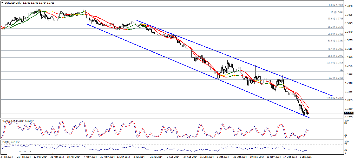 Однако, сегодняшнее решение Швейцарского национального банка о том, что он отказывается от фиксированного курса в паре EUR/CHF, привело к катастрофическому падению других валютных пар, в т.ч. и EUR/USD, что в свою очередь не позволило рынку сформировать волну (iv), в [V], в более убедительном виде.