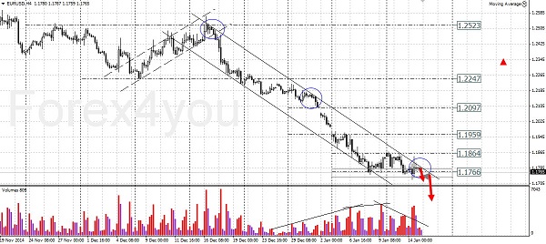 Торговля по евро/доллару продолжается в направлении нисходящего канала. В настоящее время цена консолидирует ниже верхней грани канала 1.1790, находясь на минимуме прошлой недели – уровне поддержки 1.1666