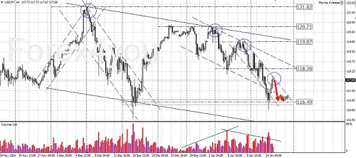 Целью восходящей коррекции выступила верхняя грань нисходящего канала 117.90. Исходя из того, что предыдущая 4-х часовая свеча закрылась в виде дожда, по всей видимости, ожидается повторный тест отметки 116.50