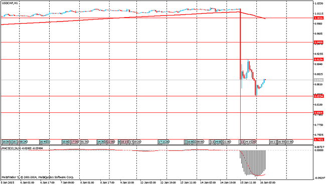 Любопытно, что вчерашнее действо в отношении швейцарского франка практически не обсуждается в СМИ. Рассказывают об «отвязке франка от евро», о «денежно-кредитной политике ЕЦБ и ШНБ» и пр., а в отношении пары USD/CHF хранится молчание, отмечен лишь факт укрепления.