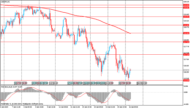 Анализируя курс иены на рынке Форекс 16 января, видим, что цена закрепилась ниже второго уровня поддержки 116,44, отскочив от линии Киджун-сен. Текущий сигнал на продажу является подтвержденным и сильным, так как Чинкоу Спан находится ниже графика цены, а цена располагается ниже облака Ишимоку, поэтому сейчас целью для нисходящего движения выступает третий уровень поддержки 114,86.