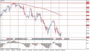 Боллинджер Бандс показывает начало нисходящего движения, полосы расширяются и направлены вниз, поэтому сейчас на рынке актуальны ордера на продажу. MACD развернулся вниз, что свидетельствует о нисходящем движении, если индикатор поменяет направление движения на восходящее, это укажет на виток коррекционного движения. Индикатор также может начать разряжаться.