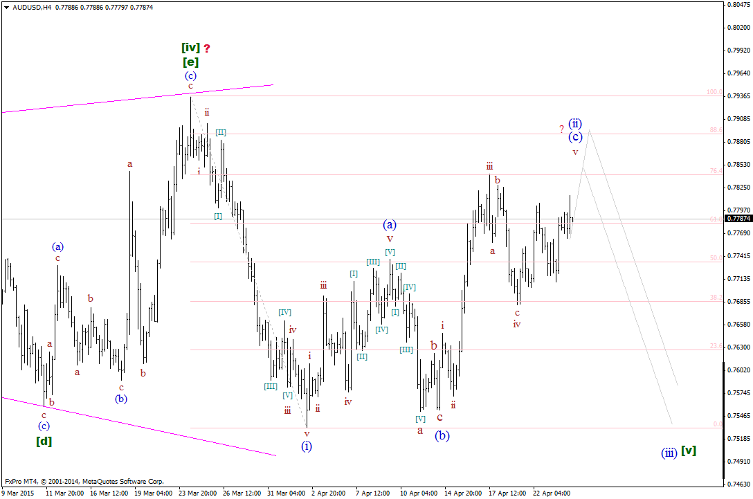 Таким образом, можно предположить, что валютная пара остается в стадии формирования медленно движущейся к своему завершению волны (с), в (ii), в [v]. При этом похоже на то, что волна v, в (с), в (ii), в [v], сильно усложнив свою волновую структуру, сохраняет, тем не менее, перспективы для роста, как минимум, к отметке 0.7850, а возможно и к целям расположенным на подходе к уровню 0,7900.