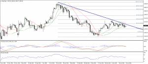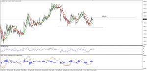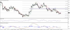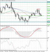 Курс валюты зажат между скользящих средних с периодами 144 и 89 (уровни сопротивления 119.60 и 119.625) с одной стороны и средней с периодом 34 (уровень поддержки 119.40) с другой, и в данный момент практически слился со средней с периодом 55.