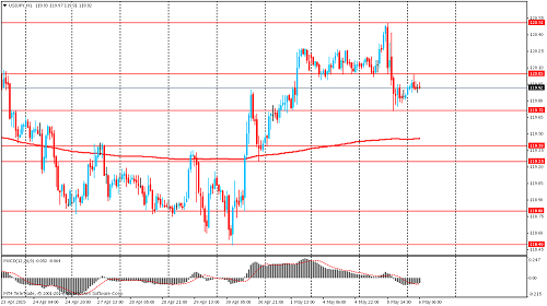 Утренний технический анализ по USD/JPY Сопротивление 3: Y121.20 (максимум 20 марта) Сопротивление 2: Y120.50 (максимум 5 мая) Сопротивление 1: Y120.05 (сессионный максимум) Текущая цена: Y119.92 Поддержка 1: Y119.70 (минимум 5 мая) Поддержка 2: Y119.25-35 (минимум американской сессии 30 апреля, MA 200 H1) Поддержка 3: Y118.80 (минимум европейской сессии 30 апреля)