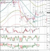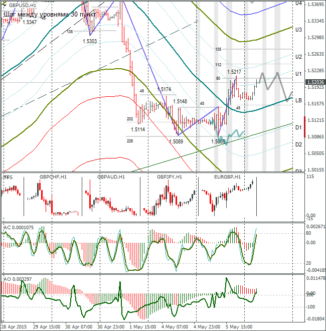 На американской сессии на фоне общего падения доллара курс фунт/доллар восстановился до 1,5217. Сработал модель «двойное основание». Рост замедлился под 90 градусом от минимума 1,5089. На 8:03 мск фунт торгуется на уровне 1,5212. 90 градус с линией U1 образовали поддержку. Я склоняюсь к тому, что фунт к концу дня вернётся к lb.