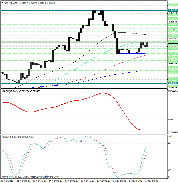 Курс валюты зажат между скользящих средних с периодами 55 и 34 (уровни сопротивления 1.5215 и 1.52625) с одной стороны и средних с периодами 89 и 144 (уровни поддержки 1.5105 и 1.4985) с другой.