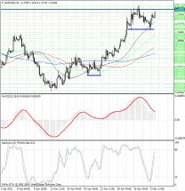 Гистограмма MACD по-прежнему расположена в положительной зоне, в ближайшее время может пересечь свою сигнальную линию снизу вверх и тем самым сформировать сигнал на покупку евро (EUR).
