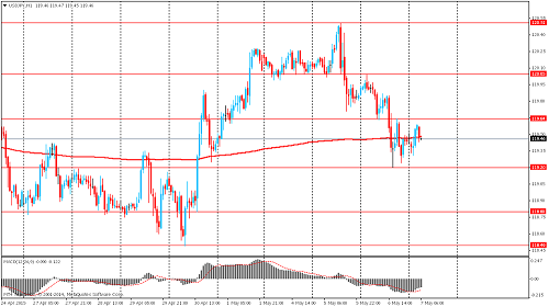 Утренний технический анализ по USD/JPY Сопротивление 3: Y120.50 (максимум 5 мая) Сопротивление 2: Y120.05 (максимум 6 мая) Сопротивление 1: Y119.65 (максимум американской сессии 6 мая) Текущая цена: Y119.46 Поддержка 1: Y119.20 (минимум 6 мая) Поддержка 2: Y118.80 (минимум европейской сессии 30 апреля) Поддержка 3: Y118.50 (минимум 30 апреля)