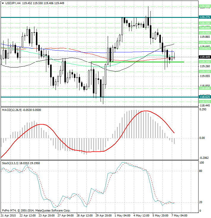 Курс валюты закрепился ниже скользящих средних с периодами 144 и 34, которые теперь являются уровнями сопротивления 119.575 и 119.725, и в данный момент практически слился со средними с периодами 55 и 89.