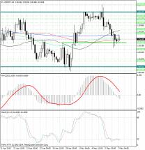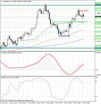 Курс валюты расположен существенно выше скользящих средних с периодами 34, 55, 89 и 144, которые являются рядом уровней поддержки 0.7910/05, 0.7850 и 0.7775.
