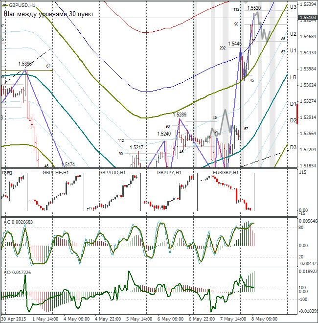 В среду до окончания выборов фунт/доллар провел день около линии lb. Из-за неопределённости волатильность была по фунту высокая, так как согласно опросам консерваторы и лейбористы набирали голосов по 34%.