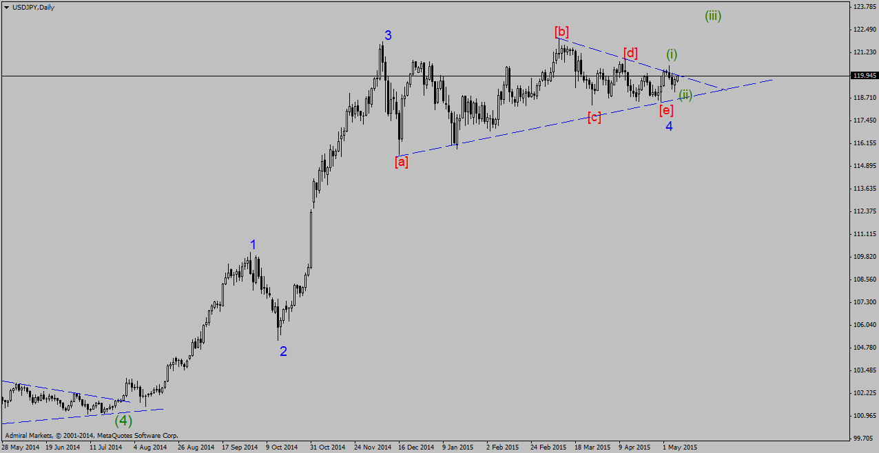 Поскольку в ближайшее время ожидаю укрепление американского доллара возьму за основной вариант начало формирования волны 5. Первые "заходные" (i) - (ii) прошли. При закреплении выше верхней образующей треугольника восходящее движение может усилиться.