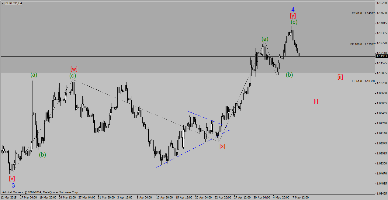 Немного не дошли до цели 1.1450. Основной вариант - завершилась коррекция в рамках волны 4. Начался новый нисходящий тренд с первой целью в районе паритета. Вариант с обновлением верхов возможен в том случае, если сейчас формируется волна (b) of [y] of 4 в виде плоскости. Но для этого не должны уходить сильно ниже уровня 1.11.