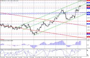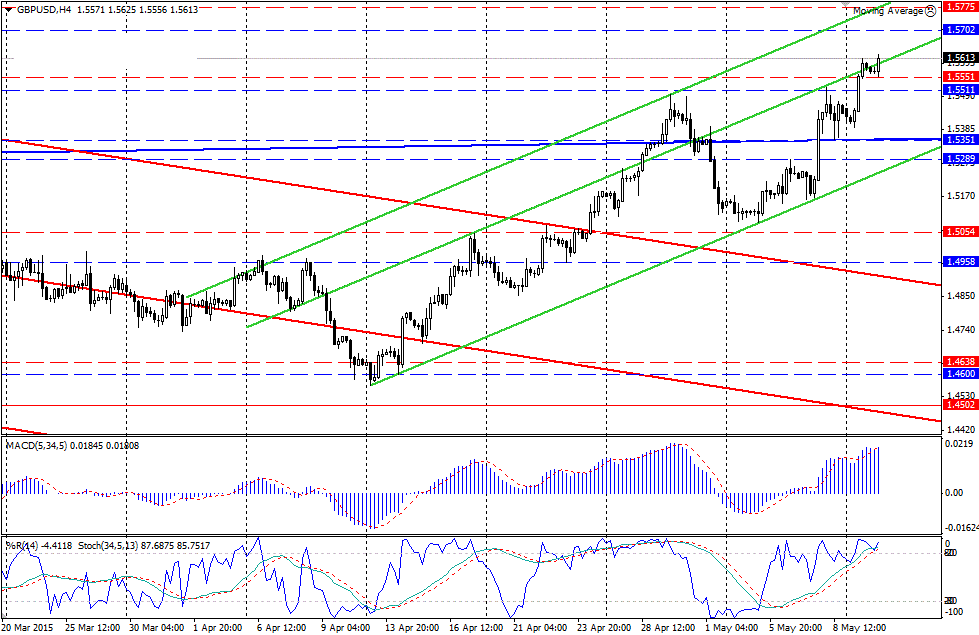 «Быки» подтвердили свой доминирующий статус – возобновили покупки и вытолкнули цену выше сопротивления на уровне 1.5510/50. Сейчас цена находится на отметках 1.5605/10, остановленная внутренней линией сопротивления восходящего канала (зеленые линии). Индикаторы не меняют своих сигналов, продолжают указывать на преимущество предпочтений «бычьего» плана, что дает основание ждать продолжения роста. Пробой диапазона сопротивления 1.5510/50 отмечался как открывающий дорогу к следующей цели на уровне 1.5700. Очевидно, в данной ситуации есть основание полагать, что этот уровень скоро будет протестирован. Отменой развитию сценария роста будет возврат цены вниз под уже поддержку на уровне 1.5510.