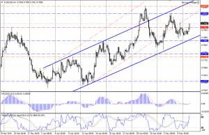 Кардинальных изменений на этой паре не произошло. После консолидации в узком боковом коридоре цена начала рост, но остается в пределах широкого диапазона ограниченного уровнями 0.8030/20 – 0.7840/50, отмечавшегося как вероятный район пребывания торгов в ближайшее время. Сейчас пара находится на отметках 0.7950/40. Индикаторы продолжают демонстрировать отсутствие согласованности — R% и MACD теперь направлены вверх, а SS остается в горизонтальном движении. По всей видимости, неопределенность сохраняется, и пока нет оснований менять ожидания, связанные с продолжением консолидации торгов в диапазоне 0.8030/20 – 0.7840/50. Перспективы определятся при пробое одного из этих уровней.