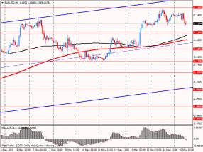 Дневной технический анализ по EUR/USD Сопротивление 3: $1.1533 (максимум 3 февраля) Сопротивление 2: $1.1497 (максимум 5 февраля) Сопротивление 1: $1.1450 (максимум 17 и 19 февраля) Текущая цена: $1.1354 Поддержка 1: $1.1300 (психологический уровень) Поддержка 2: $1.1201 (минимум 13 мая) Поддержка 3: $1.1126 (минимум 11 мая) на часовом и четырехчасовом графике сформировалась медвежья дивергенция по индикатору MACD, что сигнализирует о возможной смене направления движения цены. Также добавим, 14-ти дневный индекс относительной силы (RSI (14) на D1) приблизился к уровню 70, что также говорит в пользу снижения. В случае спада, важной целью будет средняя линия восходящего канала.