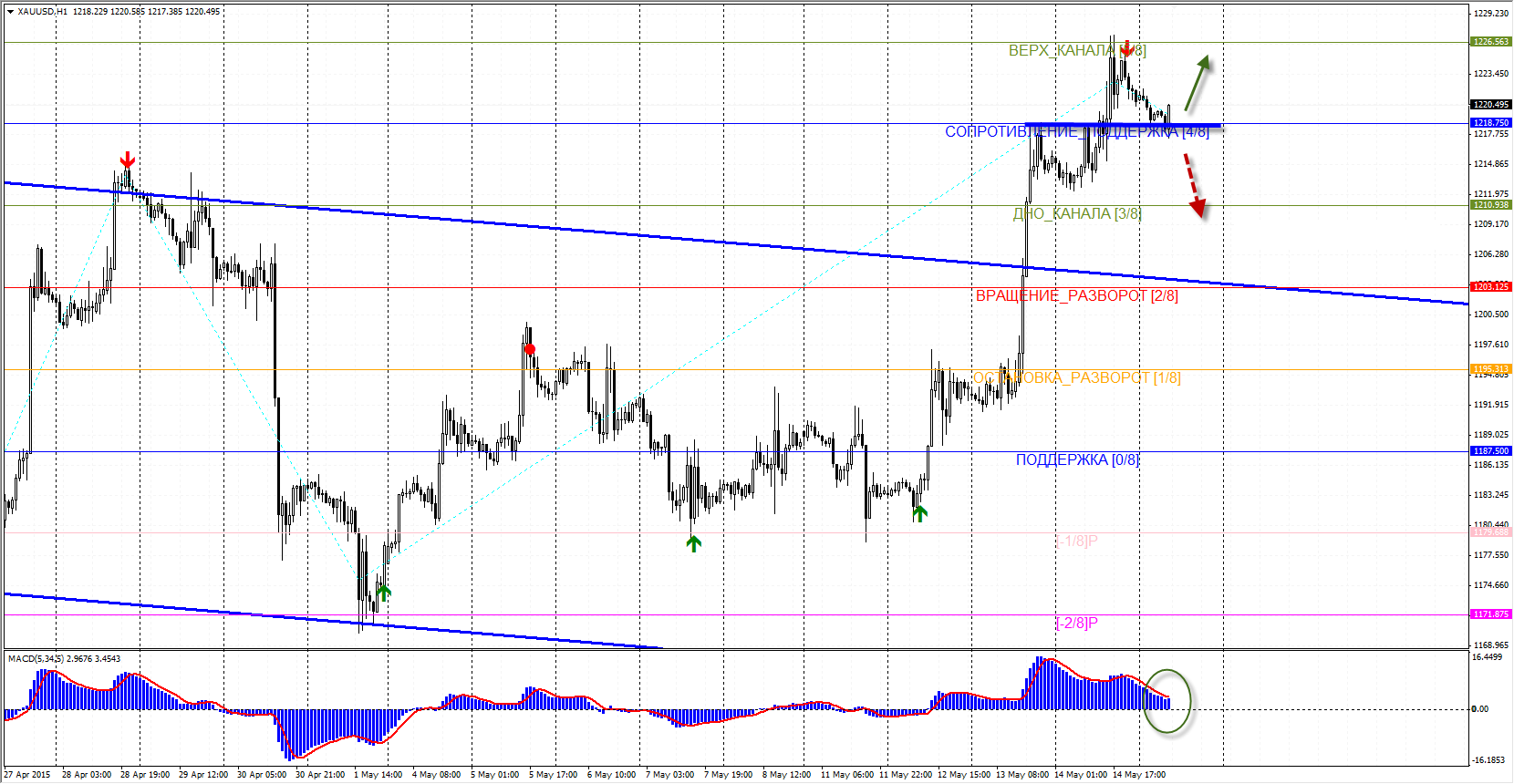 Сценарий №2: продажа ниже уровня 1215.00 с целью 1205.00.