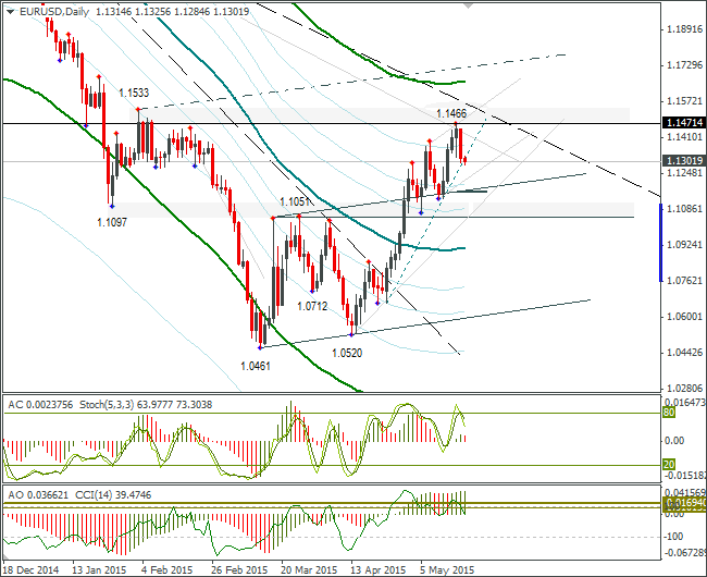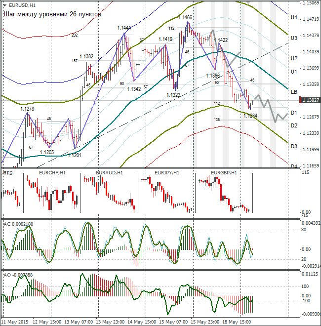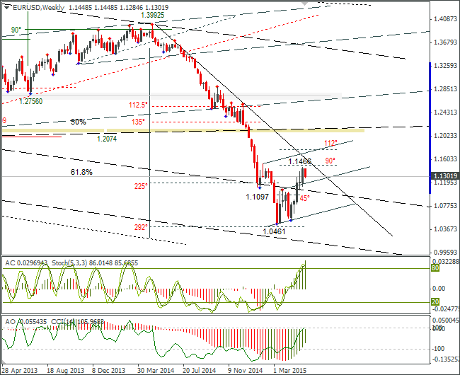 Что привлекает внимание в новостном фоне? Противоположные публикации, появляющиеся в одно и то же время. К примеру, одна статья бросается в глаза заголовком о повышении ставки ФРС США в июне, а в другой говорится о дальнейшем растягивании «удовольствия» ожидания до начала 2016 г. в связи с потоком негативной макроэкономической статистики из США. Тут же появляются статьи с заголовками о снижении прогнозов в отношении цен на нефть, хотя при ознакомлении с содержанием обнаруживается обратное: Goldman Sachs пиарит рост. Одним словом, есть «журналисты», которые еще отрабатывают прежние заказы (или просто морочат голову), а другие уже строчат на новую тему. К чему бы это? Возможно, рынок готовится к сильным движениям.