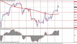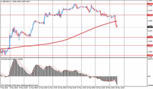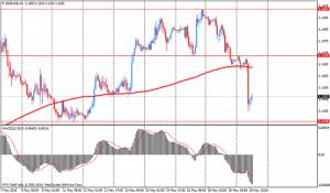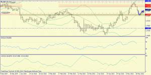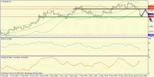 Дневной график: пара вплотную подошла к важной поддержке от средней полосы Боллинджера (1.1122). Если быки не смогут "оттолкнуться" вверх из данной зоны, то евро упадет к нижней линии (1.0689)