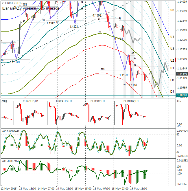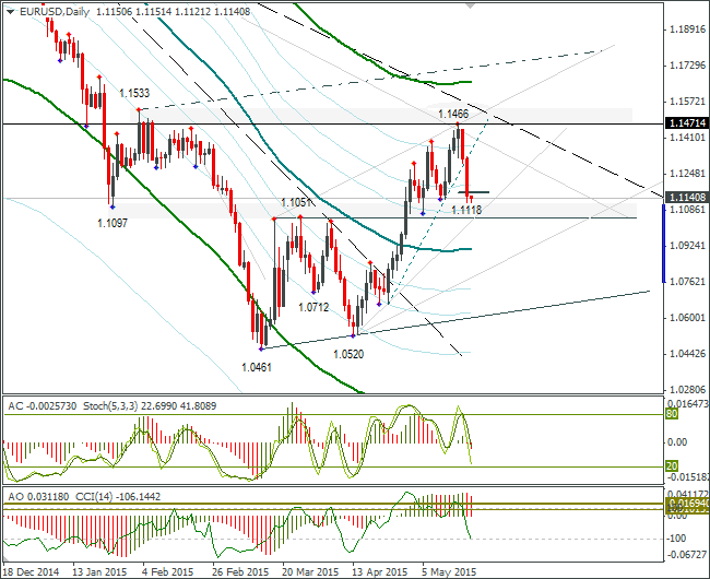 На дневном графике евромедведи полностью перекрыли рост за предыдущую неделю и принизили минимум 1,1130 от 11 мая. Формируется разворотная модель. Не хотелось бы, чтобы курс евро/доллар вернулся к 1,1355 для формирования правого плеча. Ведь если евро отскочит от 1,1118 трейдеры распознают на днях модель голова-плечи. А продавцам это надо? Покупателям - да, чтобы закрыться, а продавцам - нет. Им лучше, чтобы евро в течение двух дней закрепился под зоной 1,1070/50. Ближайшая цель 1,1070.
