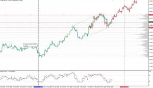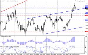 Сопротивление на уровне 120.30/50, как и ожидалось, было протестировано и на этот раз не устояло. Пробой данного препятствия открыл дорогу вверх, и цена поднялась к первой отмечавшейся ранее цели – уровню 121.20, где встретила очередное сопротивление. Сейчас торговля ведется на отметках 120.90/80. Часть индикаторов, R% и MACD, указывают на некоторое ослабление «бычьих» настроений, но уверенно поднявшийся в зону перекупленности SS дает основание считать, что остановка роста временная и по завершению консолидации пары, которая может проходить в довольно широком диапазоне 121.20-120.50, подъем возобновится. В данной ситуации рост к следующей цели, определенной на уровне 121.80/90, остается высоковероятным событием.