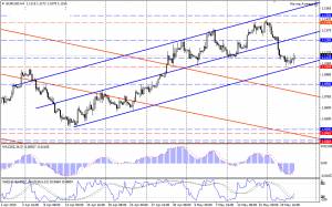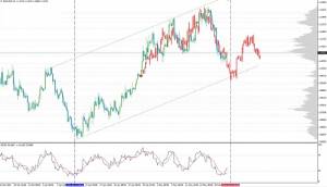 Поддержка на уровне 1.1050/60, которая называлась ключевым препятствием на пути вниз, не позволила цене продолжить падение. Торговля переместилась немного вверх и сейчас ведется на отметках 1.1150/60. Тем не менее, индикаторы не спешат сигнализировать о явной смене настроений – R% и MACD неуверенно откатывают вверх, а SS вошел в зону перепроданности, что может свидетельствовать о коррекционном характере наблюдающегося отката. Очевидно, в данной ситуации сохраняются основания полагать, что «медвежьи» настроения на рынке не утратили своего преимущества и падение пары скоро возобновится. Пробой поддержки 1.1040/50, совпадающей линией тренда восходящего канала (синие линии), укажет на разворот в нисходящее движение, которое может быть формированием очередного элемента коррекции в широком диапазоне 1.1450 – 1.0500/1.0460, или началом следующего этапа среднесрочного «медвежьего» тренда, который опустит пару к новым минимумам.