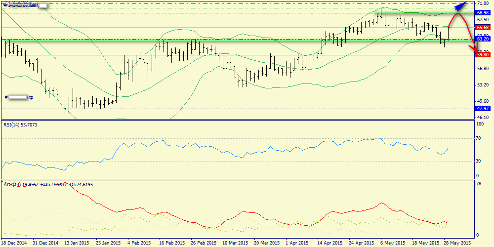 Дневной график: ключевое сопротивление расположено на 68.98. Любое движение выше будет означать присутствие бычьего потенциала и угрозу слома южных сценариев.