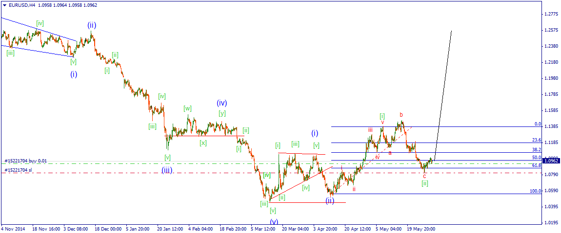 Такое движение может вполне оказаться коррекционным, но все же рассматривается вариант с развитием восходящего импульса, потому как такой расклад в данный момент выглядит наиболее вероятным: сформировался зигзаг который завершил свое развитие на уровне 61.8% фибо.