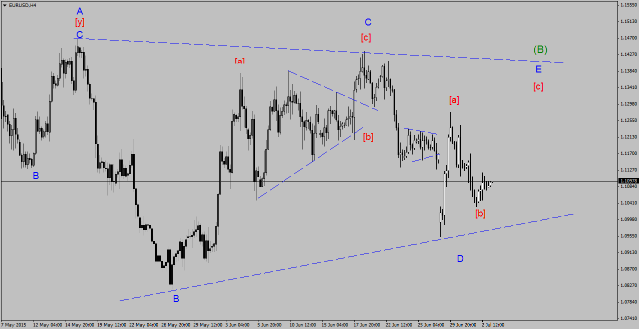 Ничего не поменялось. Ожидаю формирование волны [с] of E of (B). В случае пробоя минимума волны D и начала ускорения падения можно будет говорить о завершении всего треугольника на уровне 1.1280.