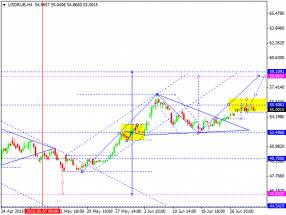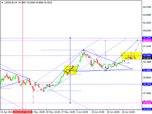 Российский рубль торгуется без изменения в консолидации под уровнем 55.50.Основным сценарием рассматриваем рост на пробой вверх и продолжение консолидации над пробоем. Ожидаем развитие фигуры продолжения роста. Далее - опять выход вверх на продолжение роста с отработкой цели на уровне 58.50. Далее ожидаем снижение к уровню 52.50.
