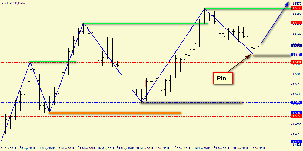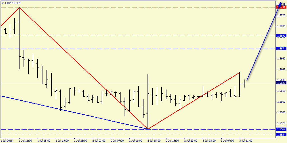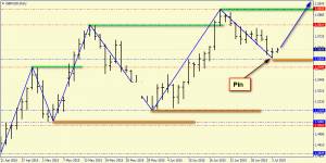 Дневной график: существенная заявка на окончание нисходящего свинга - пинбар. Не самый качественный по форме, как независимый сигнал, но вполне передающий ослабление медведей. Структура так же выглядит логичной, поэтому рост может начать непосредственно с текущих уровней с целью пробоя последней вершины (1.5933)