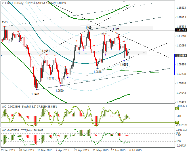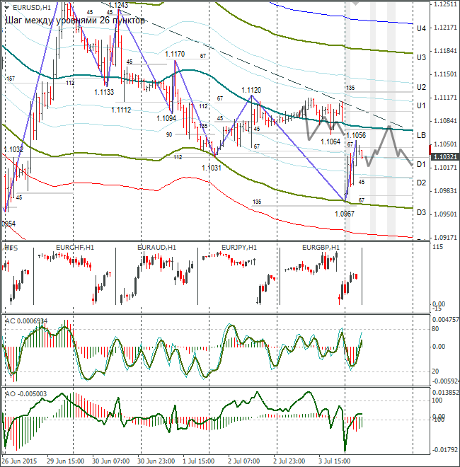 В пятницу торги по евро проходили относительно спокойно. Ликвидность на рынке в американскую сессию была невысокая из-за выходного дня в США. Многие трейдеры воздерживались от торгов в ожидании результатов греческого референдума. Курс евро/доллар торговался в течение дня выше линии lb и закрылся на отметке 1,1103.