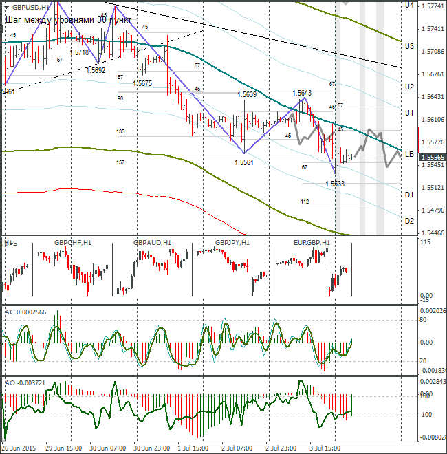 После греческого референдума курс фунт/доллар открылся снижением и в данный момент торгуется по 1,5556 против азиатского минимума 1,5533. Макроэкономических событий на понедельник запланировано мало, поэтому я жду возврат фунта к 45-му градусу и закрытие дня у линии lb.