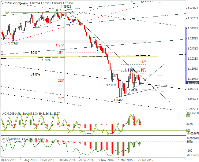 Греция провела референдум. Греки сказали «нет» кредиторам. Евро открылся снижением и сейчас торгуется по 1,1030. Частично гэп закрыли, но думаю, как и в прошлый понедельник его закроют полностью на европейской сессии. Недельные индикаторы указывают на высокую вероятность пробоя трендовой линии.