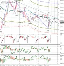 Рынок после греческого референдума открылся с гэпом у трендовой линии. Продавцы замарали линию, но пробить её пока не удалось. По индикаторам картина смешанная, а вот отскочить могут. Опять же если смотреть положение индикаторов на недельном периоде, то евро рискует упасть к 1,0818.