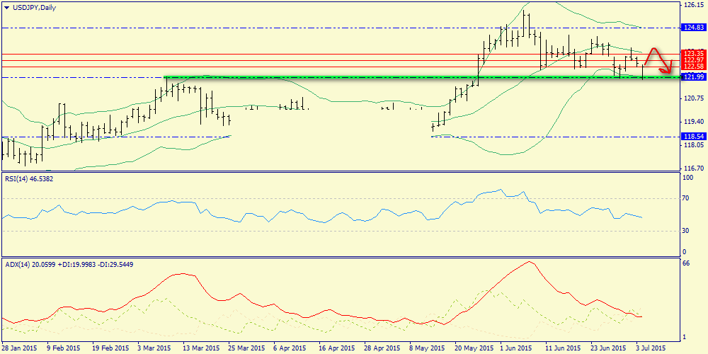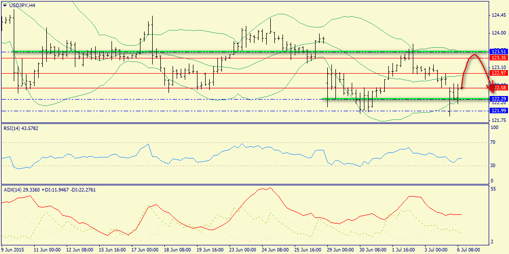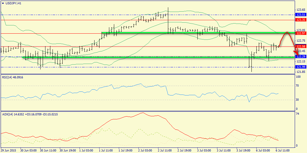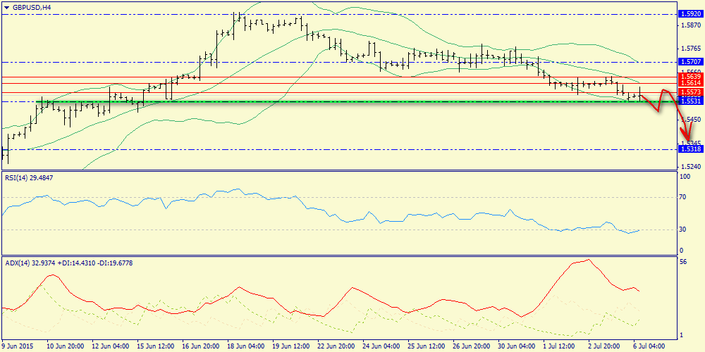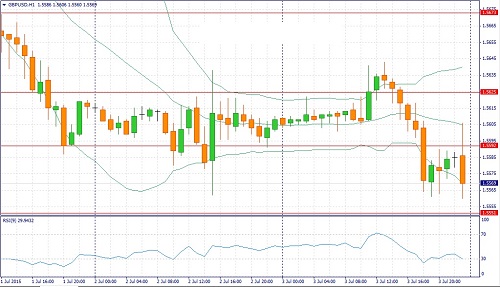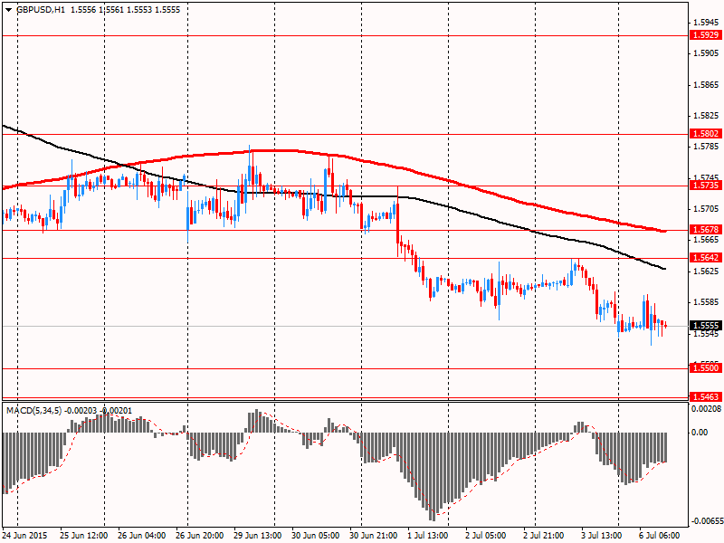 Рынок откроется с гэпа на фоне итогов народного референдума в Греции, однако размер гэпа будет меньше, чем в паре EUR/USD. Опубликованный в пятницу релиз по деловой активности в сфере услуг Великобритании хоть и вышел позитивным, но если смотреть на внутриквартальную динамику – то наблюдается плавное замедление. В этой связи, прогнозы Банка Англии о высоком экономическом росте во втором квартале можно поставить под сомнение. Во второй половине дня Соединенные Штаты опубликуют релиз по индексу ISM для непроизводственной сферы. Этот показатель относится к числу опережающих индикаторов, которые нужно торговать по факту выхода отчета. Стоит отметить, что даже если мы увидим выход данных чуть лучше консенсус-прогноза сильной поддержки американская валюта не получит. Сильный спрос на американскую валюту будет при значении 57.7 и выше - именно при таком показателе будет наблюдаться положительная динамика во втором квартале. На этом фоне в течение дня следует ожидать флэта в рамках диапазона 1.5545 -1.5675. Необходимо выделить следующие уровни по паре фунт/доллар: уровни поддержки: 1.5551 - 1.5497 и уровни сопротивления: 1.5592 – 1.5625.