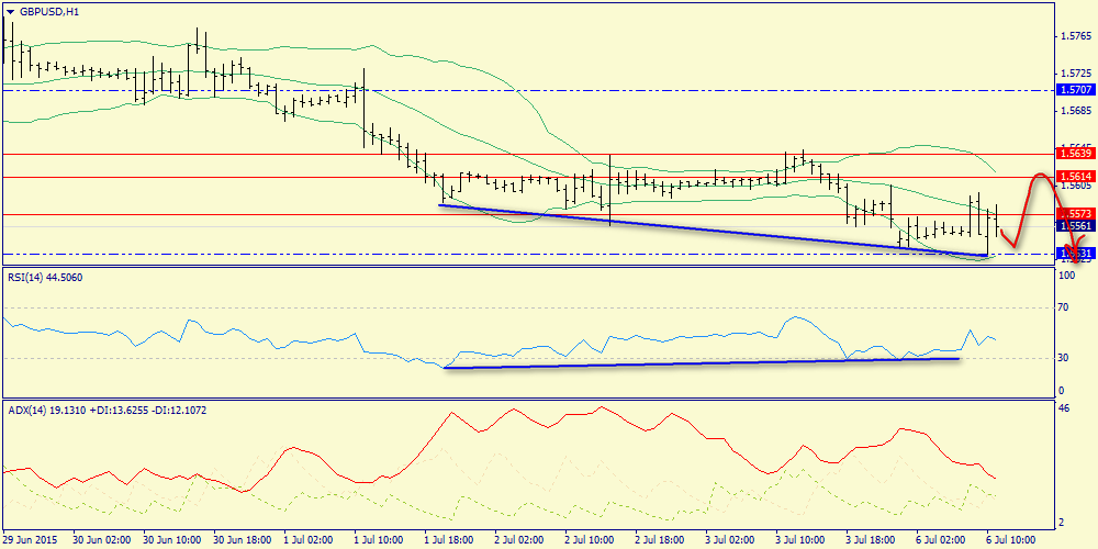 Н4: противоход связки ADX/RSI может отпустить пару в небольшую коррекцию в зону средней полосы Боллинджера (1.5614), после чего медведи могут пойти на прорыв нижнего конверта.