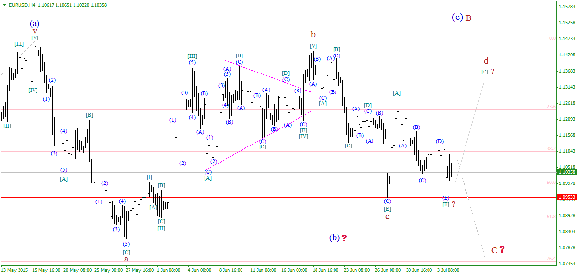 Таким образом, сложившаяся к середине сегодняшнего дня волновая картина, позволяет предполагать, что волновая структура волны (b), в В, все же, примет достаточно сложную форму, вероятно в виде горизонтального треугольника. Если это так, то для завершения волны d, в (b), в В, в составе такого треугольника, валютная пара возобновит рост котировок в направлении уровня 14-й фигуры. В то же время, сложившиеся форс-мажорные условия, могут спровоцировать динамичное падение цены, что в свою очередь, позволит рассматривать понижающий участок сформировавшийся от максимума 18-го июня, как начало волны С главного нисходящего тренда, и вызовет необходимость уточнения его волновой разметки.
