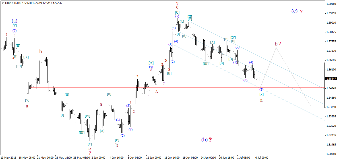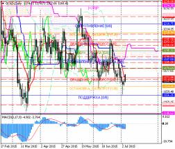 При этом, из-за сегодняшнего снижения к отметке 1.5530, волна [v], в а, являющаяся составной частью понижающего участка тренда, берущего начало от максимума 18-го июня, несколько усложнила свою волновую структуру, допуская тем самым вероятность завершения этой волны а, при попытке тестирования валютной парой уровня 55-й фигуры. Таким образом, складывающаяся волновая картина позволяет предполагать, что волна (b), все же, примет значительно более сложную форму, а цена будет оставаться еще достаточно продолжительное время в пределах коридора ограниченного уровнями 52-й и 58-й фигур.