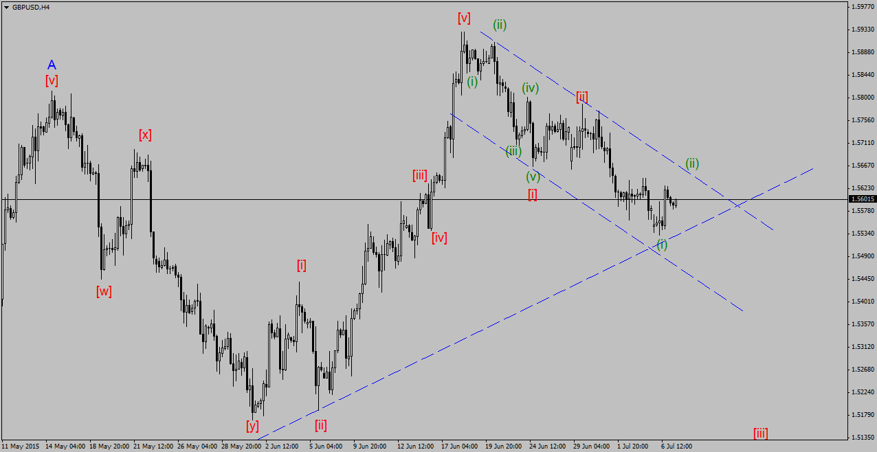 Вероятно, развивается коррекция в рамках волны (ii) of [iii]. Цель - верхняя граница канала. Под нами линия поддержки восходящего тренда на D1. В случае ее пробития начнется снижение уже в рамках волны (iii) of [iii].