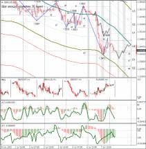 Цель по прогнозу была достигнута и причём быстро. Курс фунт/доллар достиг нижней границы МА канала и сейчас корректируется. По прогнозу я рассматриваю сегодня коррекционное движение к линии lb. В прогнозе у меня обновление минимума. Его может не быть, так как по нему в последние дни игнорировалась положительная статистика. На днях пробита трендовая линия, это сигнал к продажам фунта. Но сегодня после вчерашнего обвала жду коррекцию.